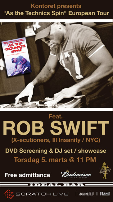 Der bør være mødepligt for alle fra stjerneturntablister til soveværelses-DJ’s torsdag aften den 5. marts, når Rob Swift fra crewsne X-ecutioners og Ill Insanity gæster Kontoret som del af sin As the Technics Spin-tour. Der vil både være DVD-fremvisning samt battle showcase og klub-sæt fra DJ legenden, alt sammen til en pris af i alt nul kroner.