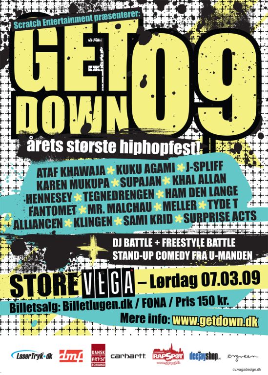Det går ned i Store Vega lørdag aften. Get Down 09 står for døren. For bare 150 dask får du uendelig meget hiphop i et maratonshow skåret efter den gode gamle jam-skabelon, hvor der er plads til både stjerner og upcoming acts. Som det høre sig bør til et jam, er der også battles på programmet. Nu er deltagerne til DJ-battlen og freestyle battlen-.annonceret.